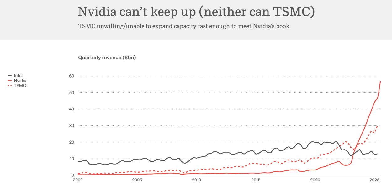 Chips: Nvidia, the dominant provider of AI chips, “can’t keep up” with demand, reporting a quarterly revenue run rate of $40 to $50 billion. Its manufacturing partner, TSMC, is similarly unable to expand capacity fast enough.