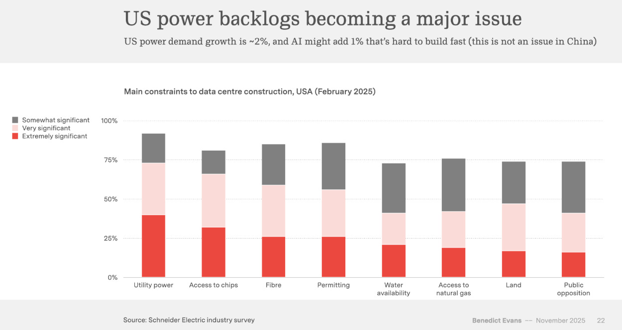 Power: For data center developers, particularly in the United States, “getting access to electricity is actually a bigger problem than getting chips from Nvidia.” Power backlogs have become a primary constraint on new construction.