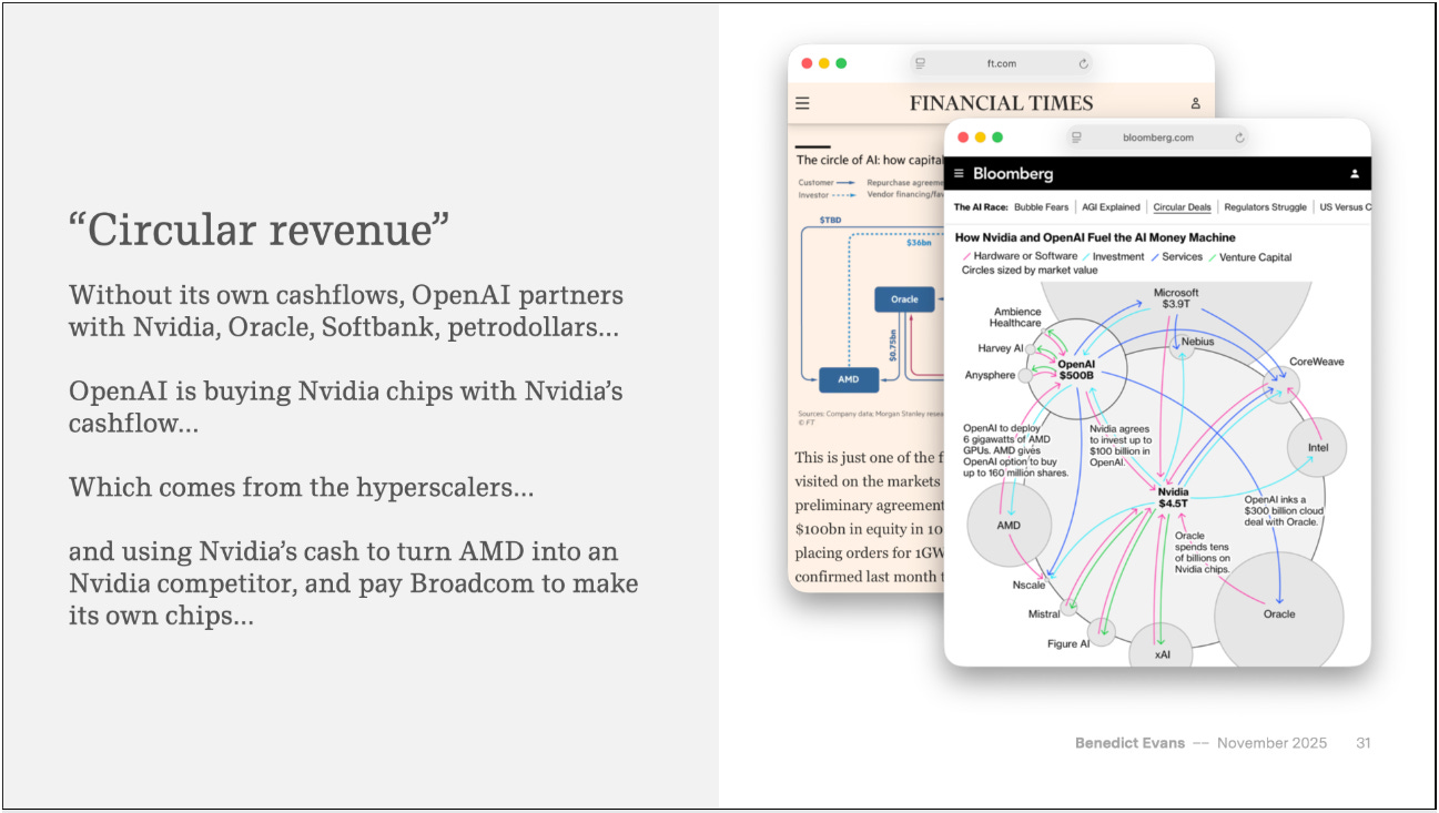 As massive AI capex shifts from being funded by cash flow to external leasing and debt, at what point does the "circular revenue" model transition from a growth