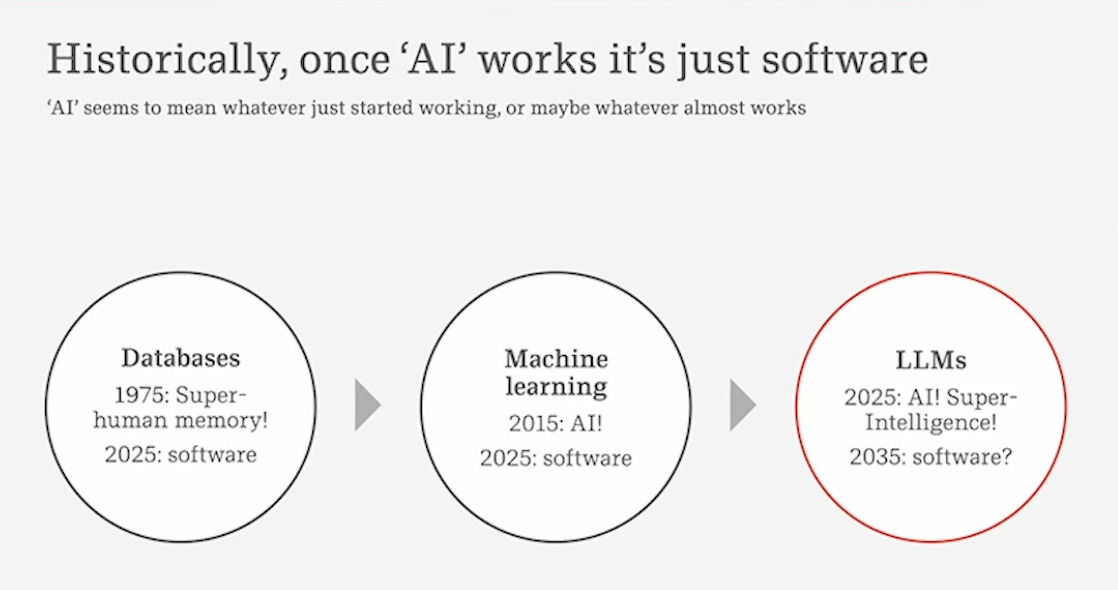 We have forgotten that the world was ever different. This cycle was perfectly captured by computer scientist Larry Tesler in 1970: “AI is whatever machines can’t do yet.” Once a task is successfully automated and integrated into our daily lives, we cease to see it as artificial intelligence. It becomes part of the baseline, the new normal. The world is permanently changed, the technology disappears into the background, and the cycle of innovation begins again with the next platform shift.