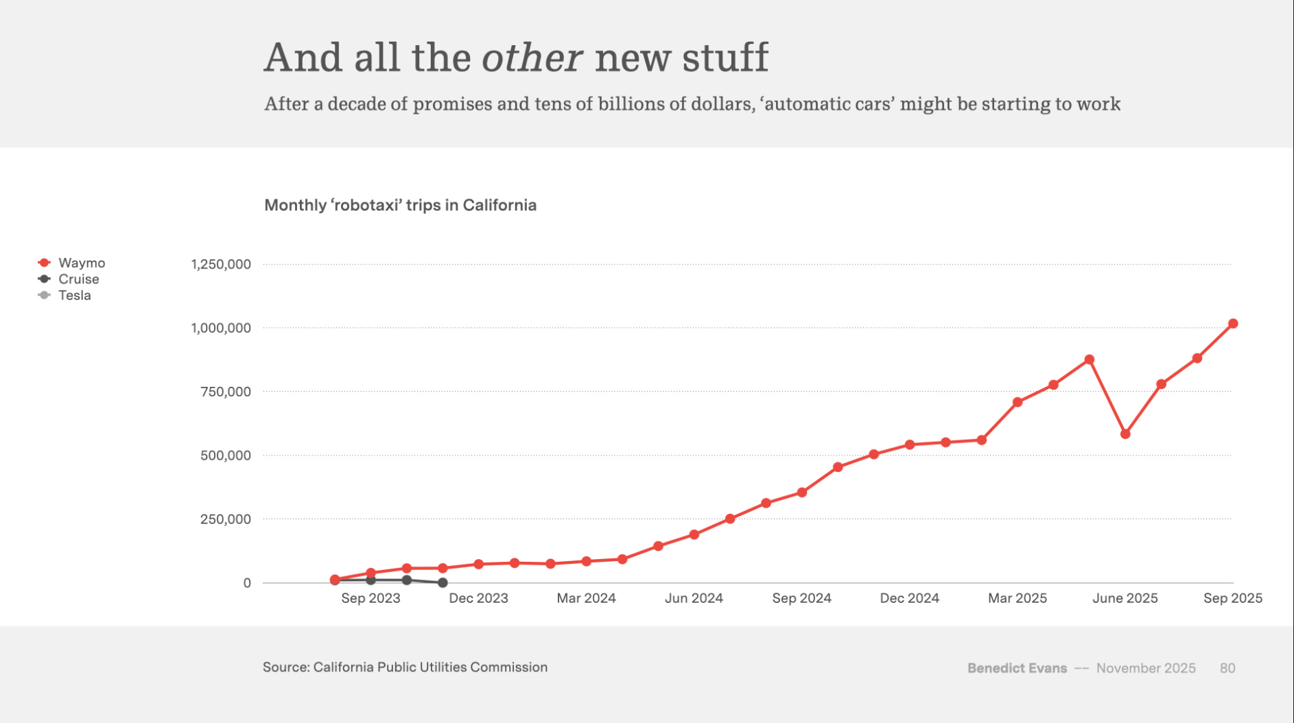 At the same time, long-gestating technologies like autonomous “robotaxis” are finally beginning to work after a decade of investment, with Waymo seeing a significant rise in monthly trips.