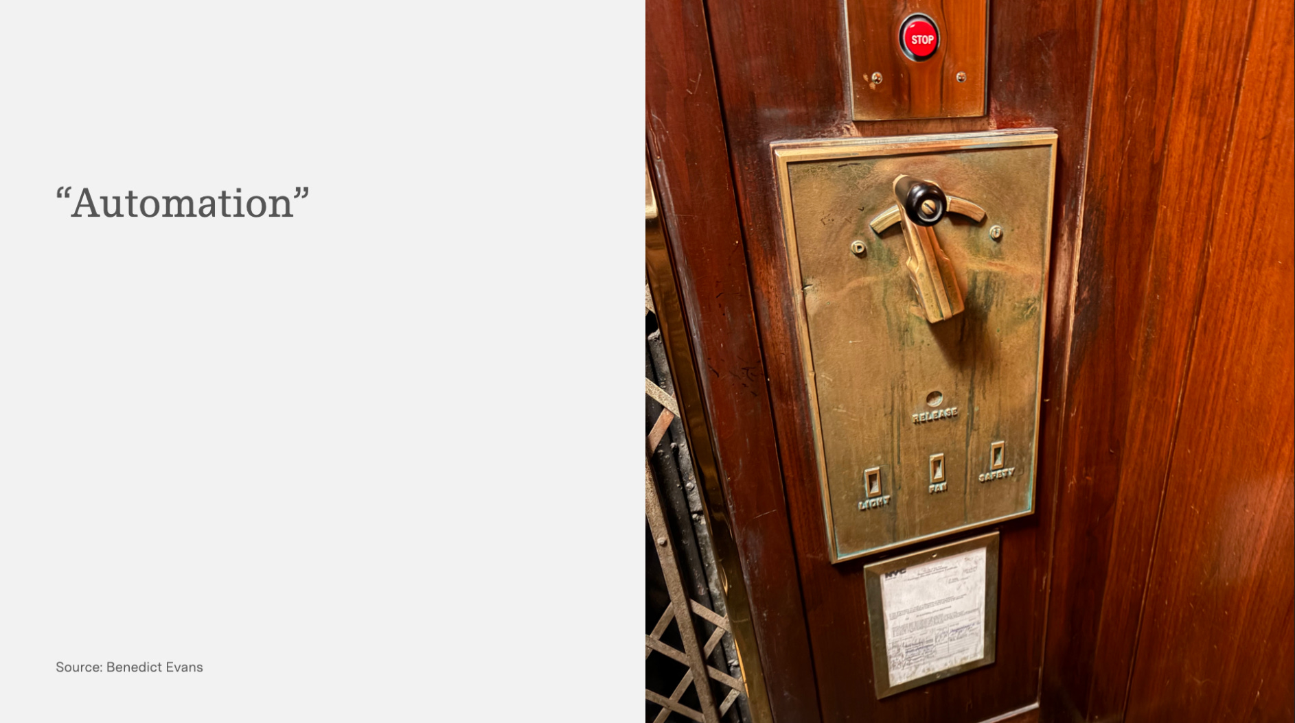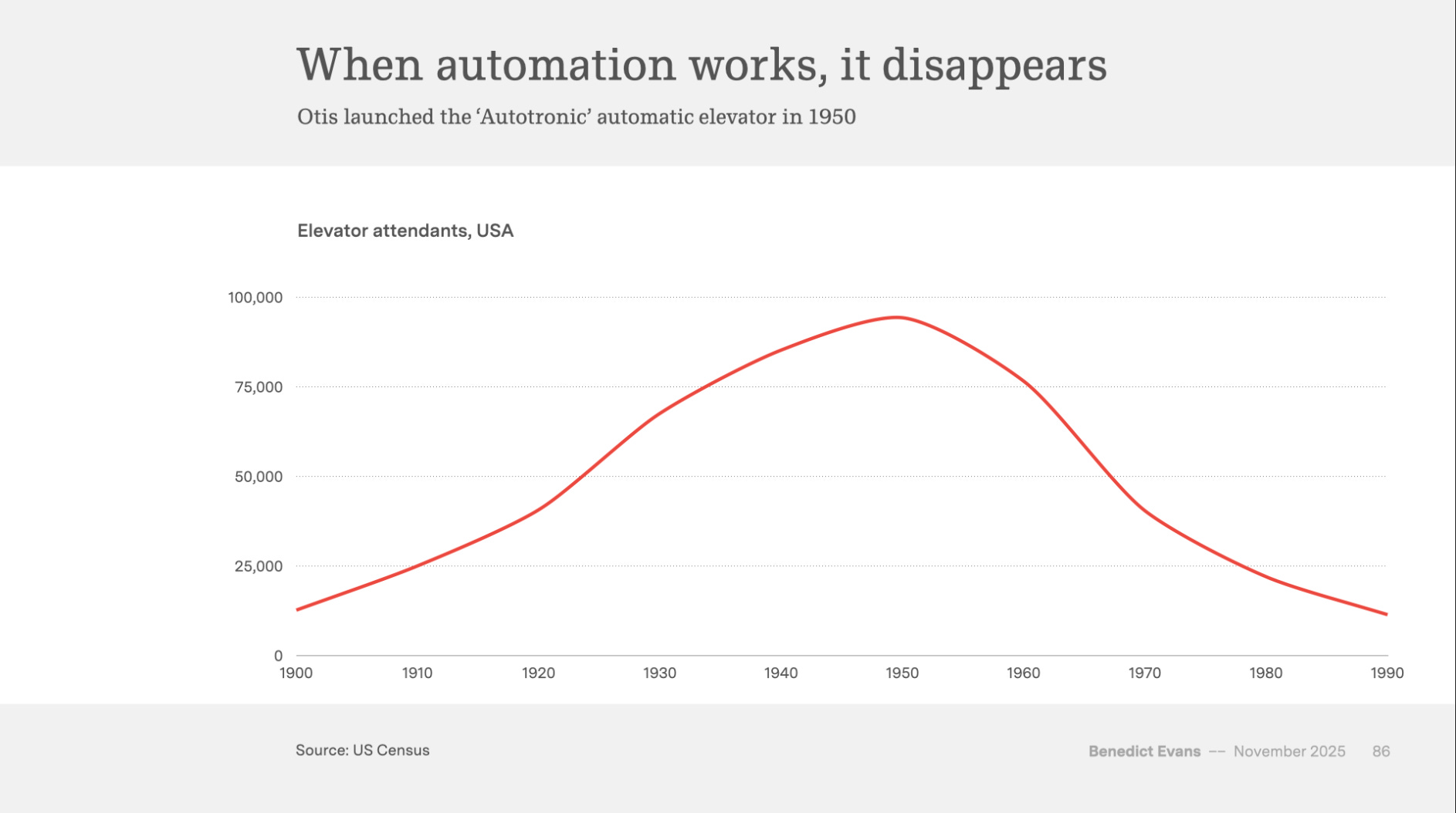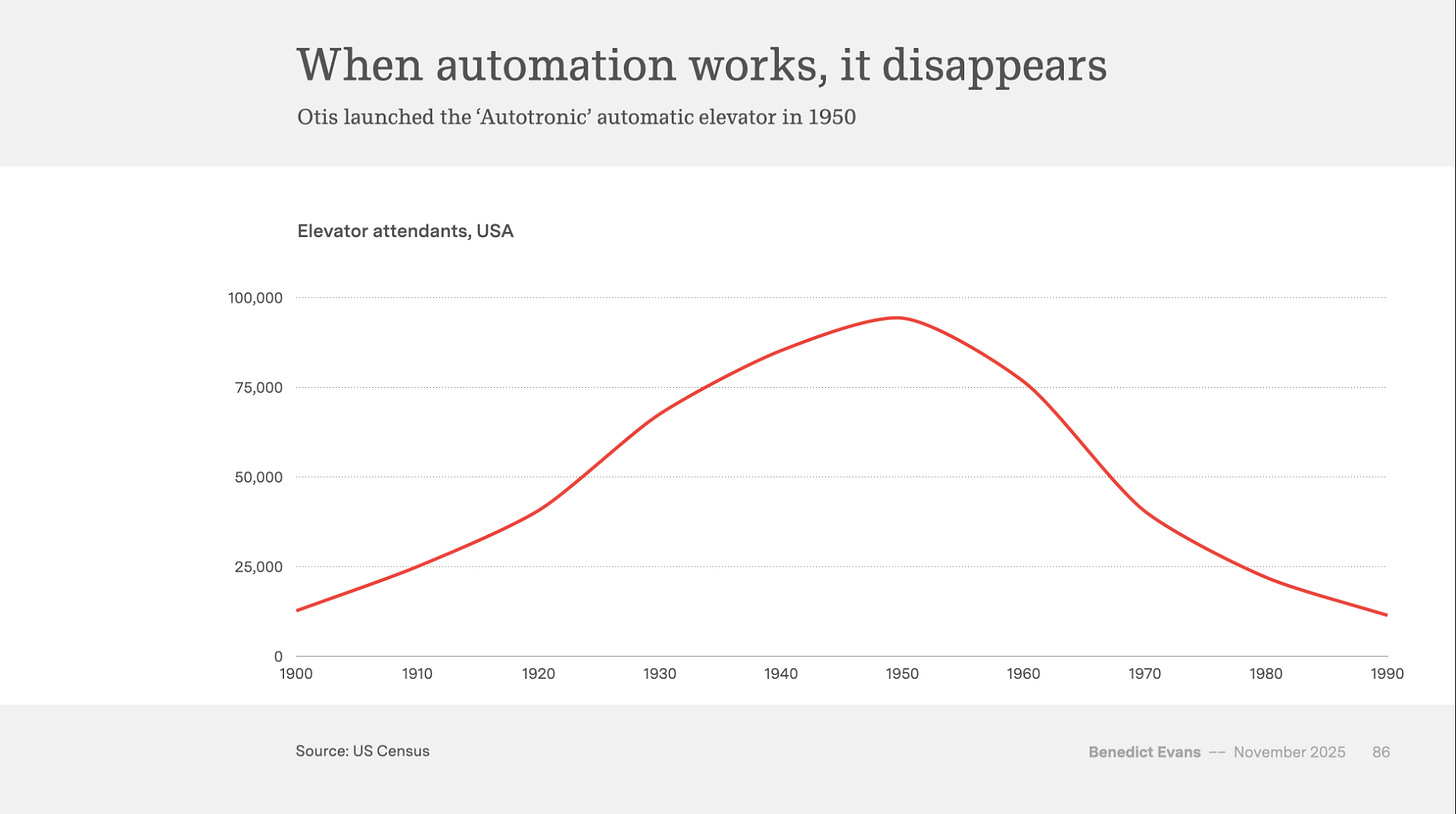 This innovation automated a job—the elevator attendant—that was once commonplace. Today, the automated elevator is so ubiquitous that we call it a “lift.”