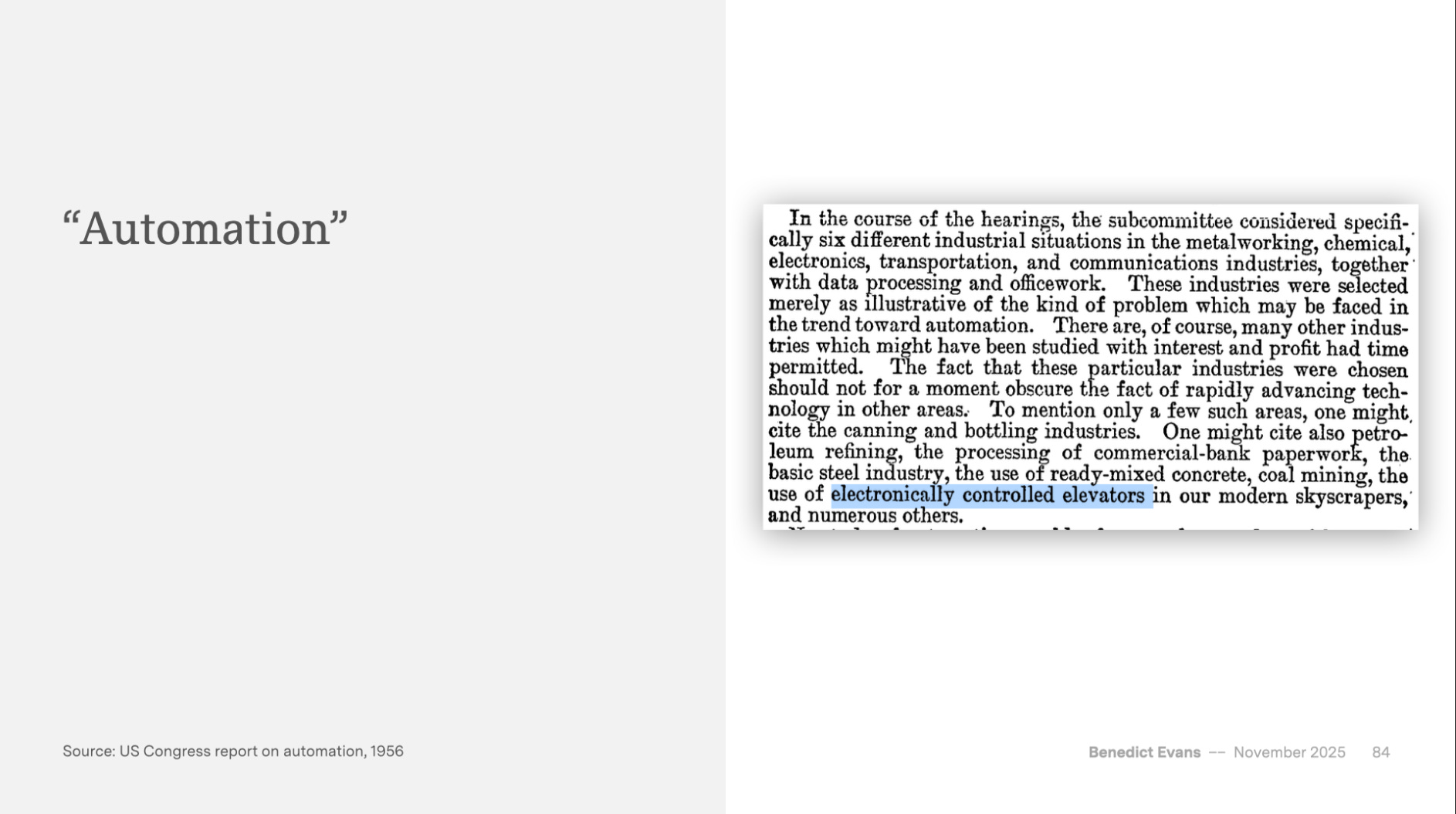 A 1955 U.S. government report on automation highlighted the “electronically controlled elevator” as a frontier technology.