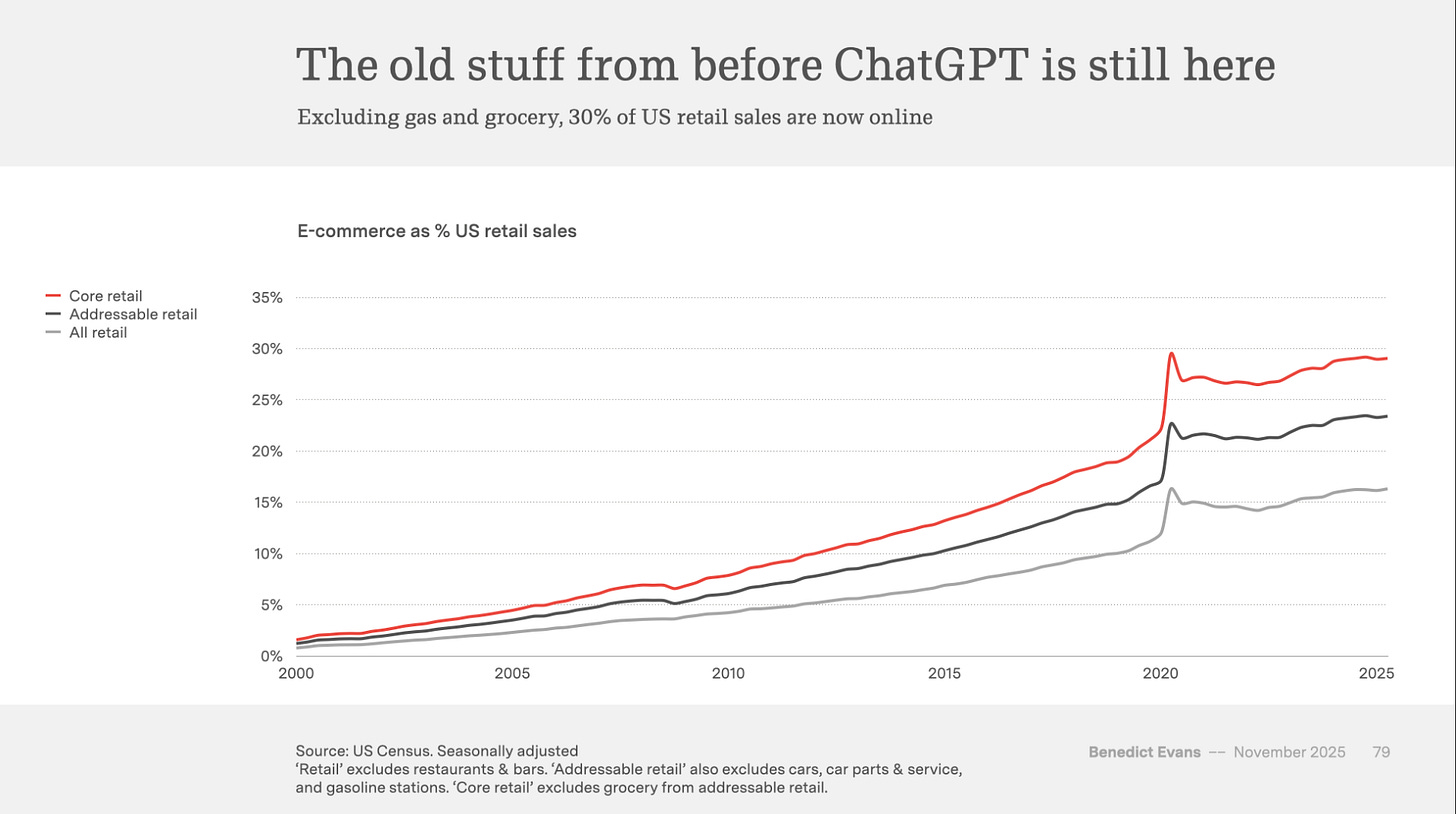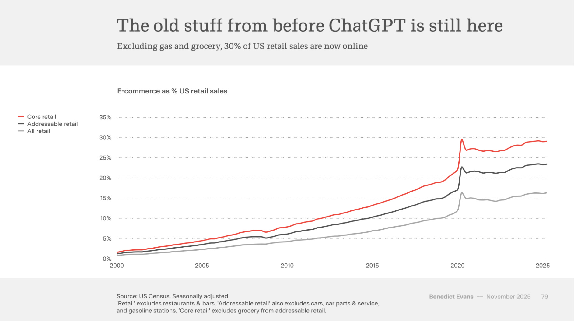 While generative AI represents the latest platform shift, it exists alongside “the old stuff” that continues to mature and “other new stuff” that has been in development for years. For example, e-commerce is not a new concept, yet it still only accounts for 30% of U.S. retail sales (excluding gas and grocery) and continues to grow.
