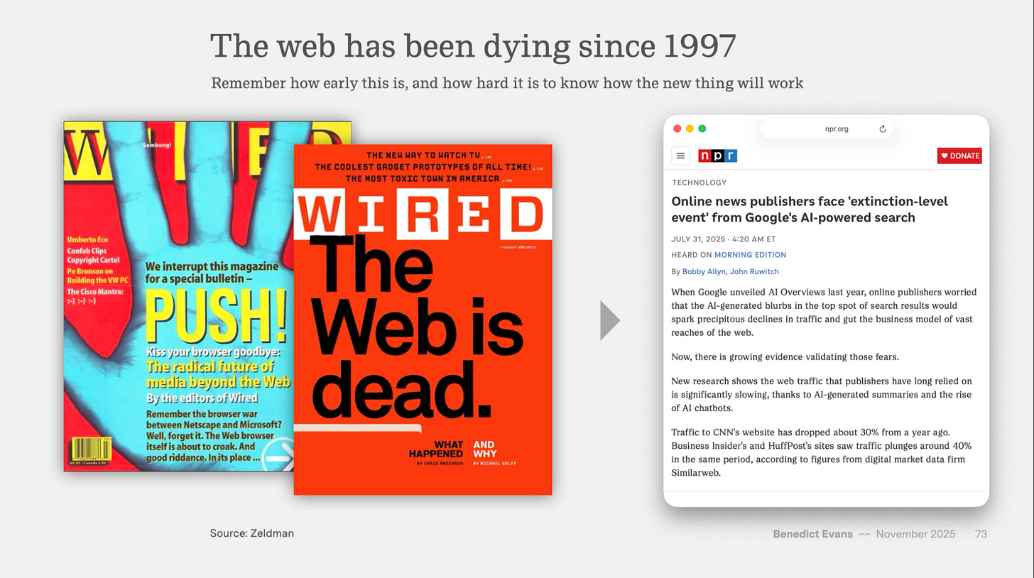 This stage is similar to the internet in 1997, when it was similarly unclear which business models or ideas would eventually succeed, leading to high levels of noise, hype, and “vibes-based forecasting”. Because the physical limits of AI are unknown, predicting its future is difficult, bubbles are expected, and early leaders are likely to disappear before the “dust settles” and the technology becomes a basic part of daily life.